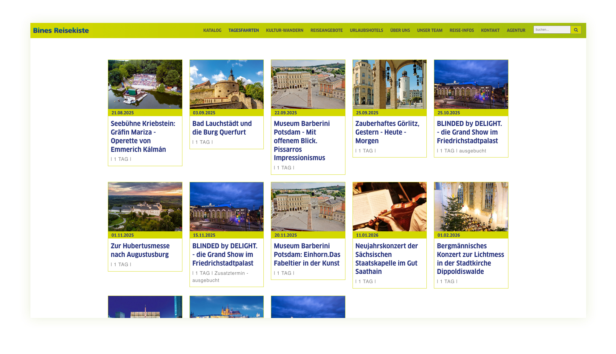 Hier gelangen Sie zu unserer Webseite Bines Reisekiste mit den Kunst- und Kulturreisen. Dort können Sie sich die Reisen anschauen und auch buchen.